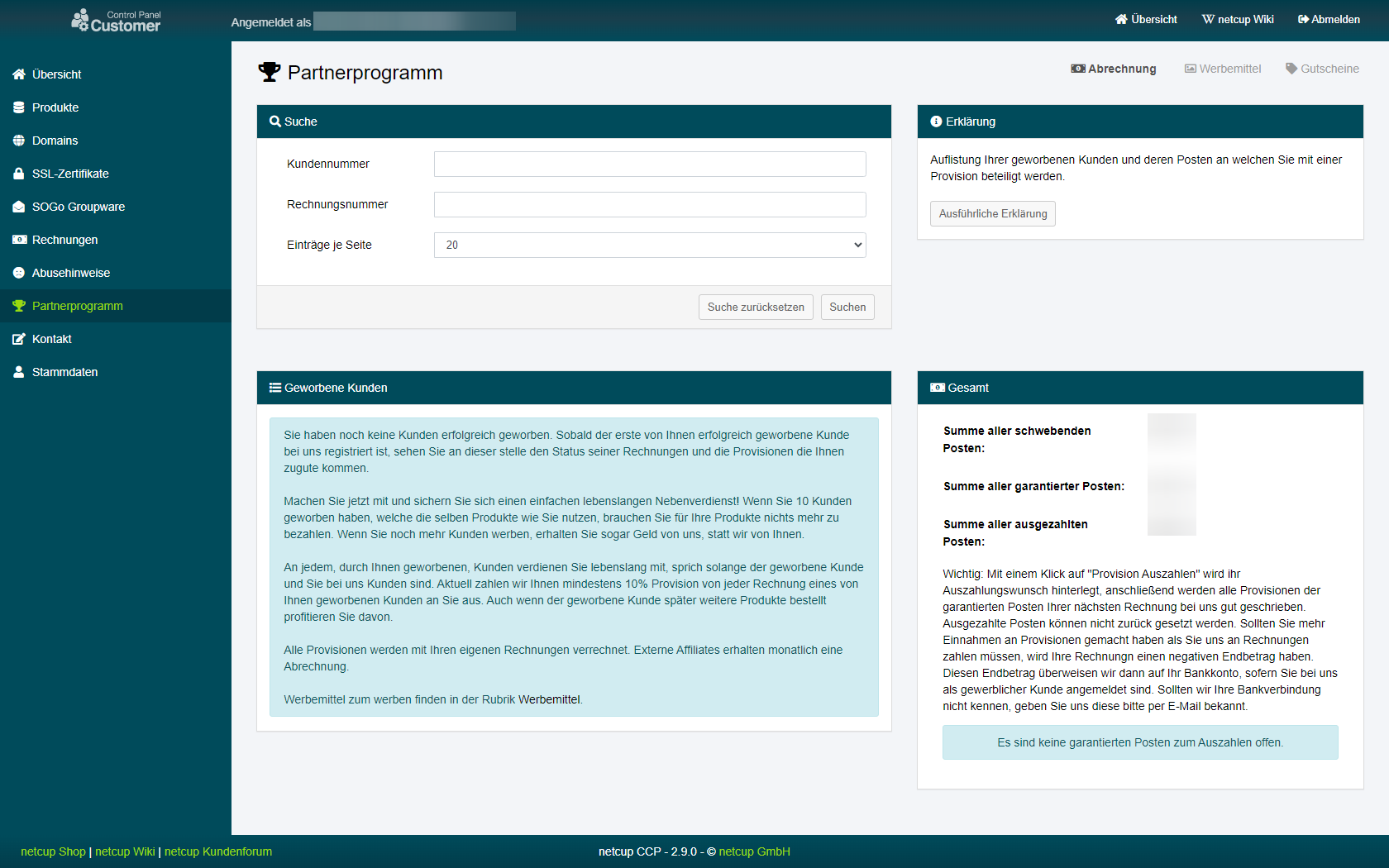 Über das Partnerprogramm können neue Kunden für die netcup GmbH geworben werden. Der Werber eines neuen Kunden wird automatisch mit 10 % an den Einnahmen beteiligt, die der geworbene Kunde der netcup GmbH einbringt. Diese Einnahmen stellen eine Provision dar, die dem Werber als Gutschrift auf seinen eigenen Rechnungen gutgeschrieben wird.