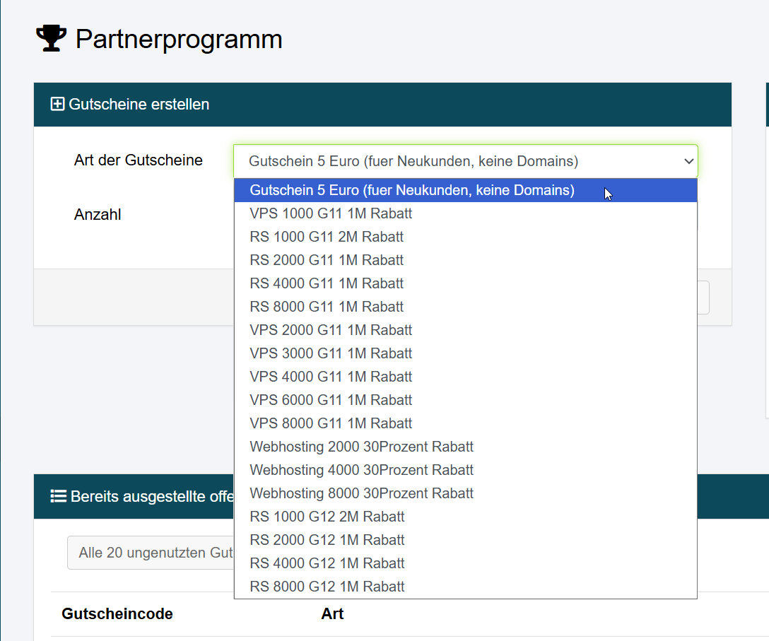Der Werber kann über Gutscheine Kunden werben. Hierzu kann der Werber im Partnerprogramm Codes erstellen, die der Interessent bei seiner ersten Bestellung einlösen kann. Diese Codes sind eindeutig, damit der neue Kunde seinem Werber im Partnerprogramm zugeordnet werden kann.