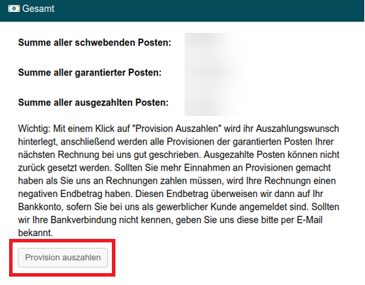 In der Registerkarte Abrechnung siehst du im Abschnitt Gesamt deine Gesamteinnahmen, die du mit deinen erworbenen Kunden erzielst. Die Auszahlung der Provision erfolgt nicht automatisch.