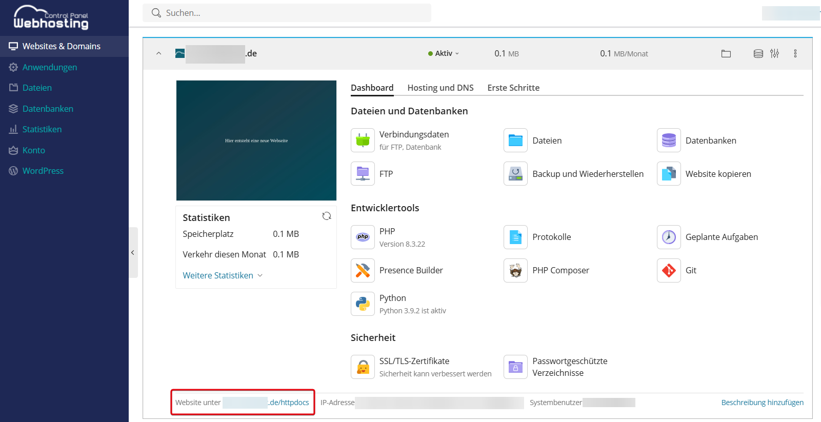 - Öffne den Dokumentenstamm der Domain, indem du unten links auf das verlinkte Verzeichnis klickst.