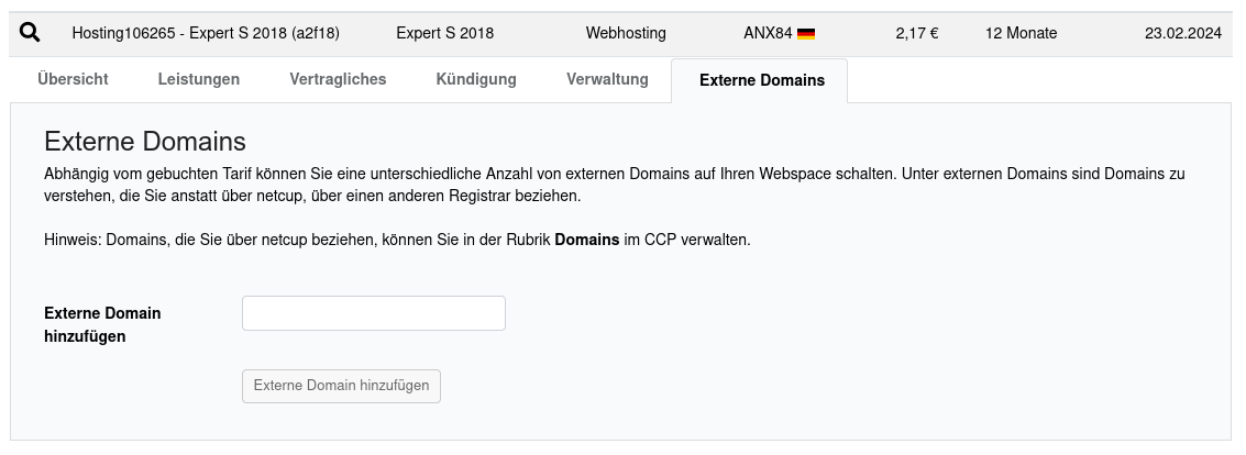 Mit unseren aktuellen Webhosting-Tarifen kannst du 2 Arten von Domains nutzen: netcup-Domains, die bei uns registriert sind, und externe Domains. Externe Domains sind bei einem anderen Domain-Provider registriert. Eine Anleitung zum Hinzufügen einer netcup-Domain zum Webhosting findest du unter: Domain mit Webhosting verbinden