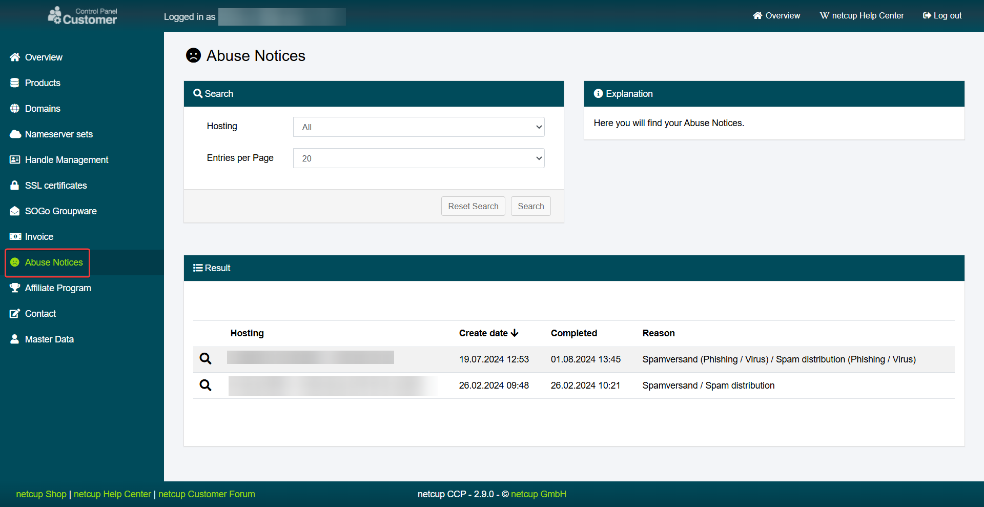In the Customer Control Panel (CCP), you will find an overview of all abuse notices received under the menu item Abuse Notices. Click the Magnifying Glass Icon next to an abuse notice to get more information.