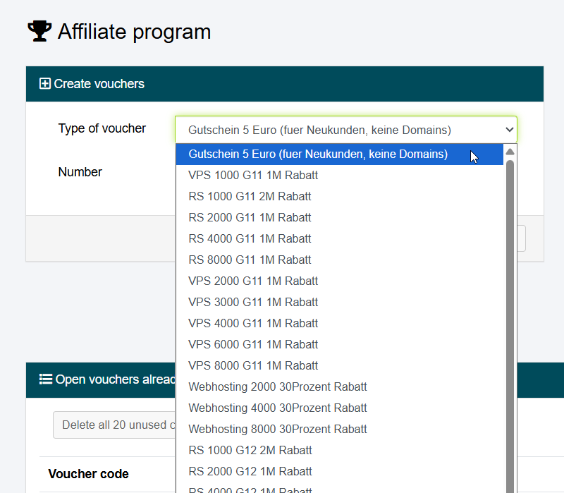 The advertiser can recruit customers via vouchers. For this purpose, the advertiser can create codes in the affiliate program, which the prospective customer can redeem when placing their first order. These codes are unique, so that the new customer can be assigned to his advertiser in the affiliate program.