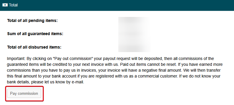 In the Account statement tab, you can see your total earnings from acquired customers in the Total section. Commission is not paid out automatically.