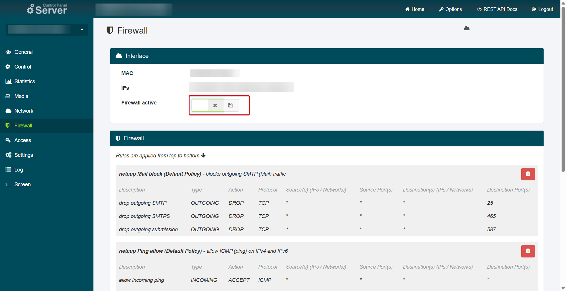 The standard firewall contains non-editable rules that allow mandatory traffic. For example, DNS traffic to the netcup DNS servers is always allowed. Additionally, rules are set by default to prevent email spamming. However, you can view these rules and remove them if necessary.
